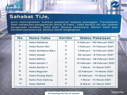 PT Transportasi Jakarta (Transjakarta) merenovasi 11 halte di lima koridor utama dalam rangka peningkatan kualitas layanan. Selama proses perbaikan, sebanyak 10 halte tersebut ditutup sementara waktu.