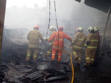 Sebanyak 14 mobil pemadam Sudin Penanggulangan Kebakaran dan Penyelamatan (Gulkarmat) Jakarta Timur dikerahkan untuk memadamkan kebakaran bengkel mobil di Jl Taman Malaka Selatan 2, RT 01/09, Kelurahan Malaka Sari, Duren Sawit, Senin (19/10).