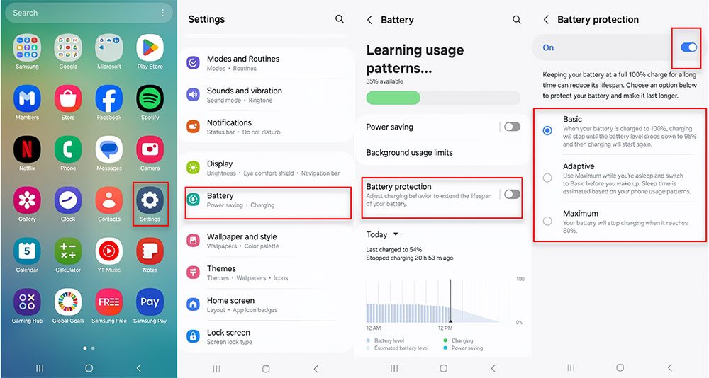 • Pilih jenis proteksi yang diinginkan sesuai kebutuhan. Terdapat 3 opsi, yaitu Basic, Adaptive, dan Basic akan menghentikan pengisian daya ketika baterai smartphone sudah dalam keadaan penuh, Adaptive untuk pengaturan pengisian daya baterai menyesuaikan dengan waktu kamu istirahat, jadi kamu tidak perlu khawatir ketika sedang mengisi baterai pada saat beristirahat. Sementara opsi Maximum diperuntukkan untuk penghentian pengisian daya ketika sudah mencapai 80 persen.