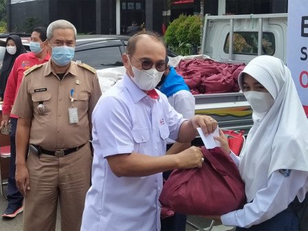 Sebanyak 85 anggota Palang Merah Remaja (PMR) yatim piatu se Kecamatan Cipayung, menerima bantuan paket sembako dan uang santunan dari PMI Kota Jakarta Timur,  Selasa (20/4).