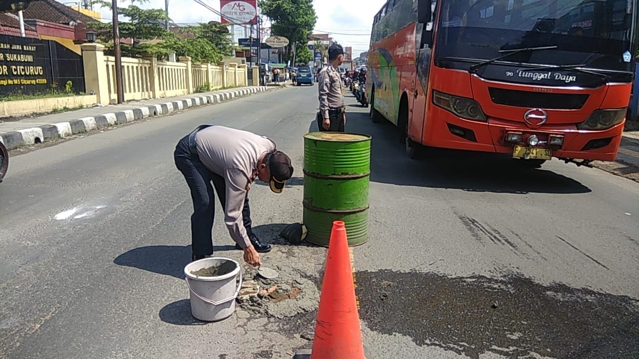 Akibat Sering Terjadi Kecelakaan, Polsek Cicurug Polres Sukabumi Polda Jabar Tambal Jalan Berlubang
