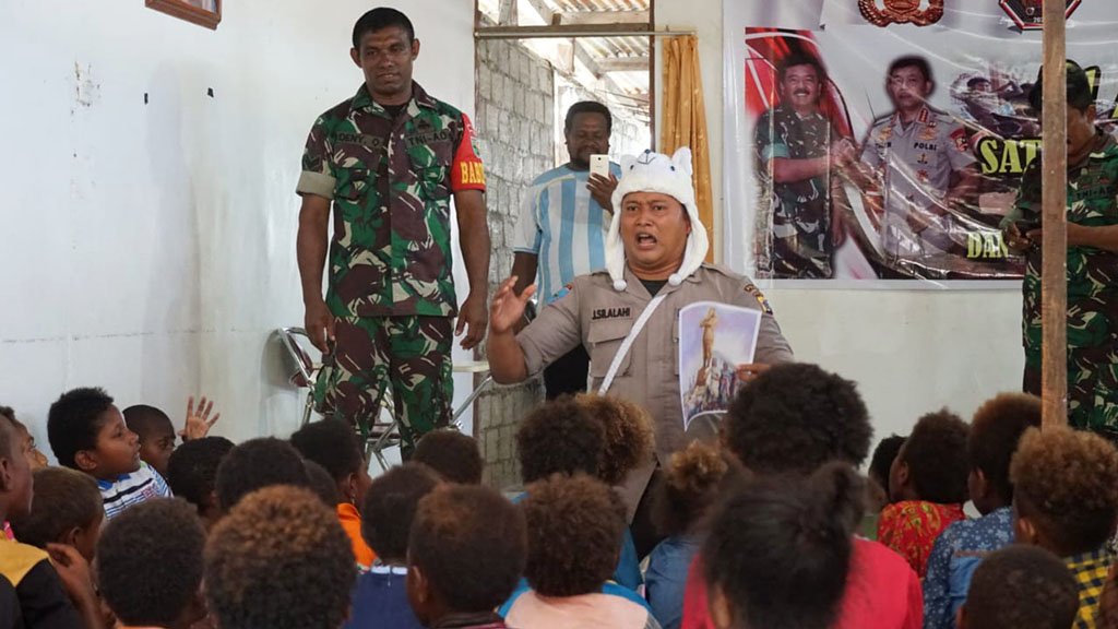 Tim Polisi Pi Ajar Aiptu Bambang Triyatwoko, Bripka Sam Saiba, Briptu Marinus Atatu bersama Babinsa kemudian bergantian memberikan pengetahuan tentang agama, suku bangsa yang ada di Papua dan Indonesia, kepulauan Indonesia, wawasan kebangsaan serta cita-cita dari anak-anak tersebut.