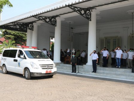 Gubernur DKI Jakarta, Anies Baswedan bersama jajaran Pemprov DKI Jakarta melakukan penghormatan terakhir dalam upacara pelepasan jenazah Sekretaris Daerah Provinsi DKI Jakarta, Saefullah di pendopo Balai Kota, Jakarta Pusat Rabu (16/9) siang. Sekda Saefullah meninggal dunia pada pukul 12:55 WIB di RSPAD Gatot Subroto setelah terkonfirmasi positif COVID-19.