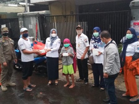 Aparatur Kelurahan Pinang Ranti, Makasar, Jakarta Timur, berkeliling kampung untuk membagikan takjil dan nasi boks ke warga.