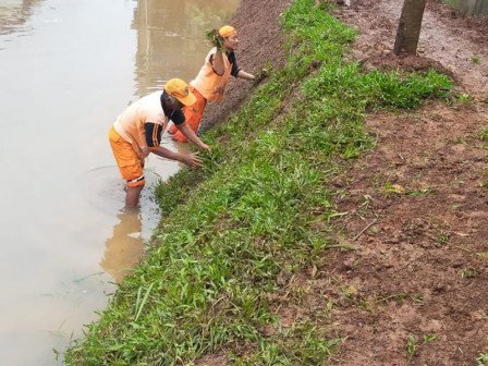 Untuk mencegah tebing longsor, bagian turap Waduk Mini Ceger di Jl SMPN 160 RT 02/05 Ceger, Cipayung, Jakarta Timur, saat ini sedang ditanami tanaman rumput gajah oleh petugas PPSU.
