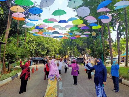Pantauan di lapangan, Jumat (13/11), ada 107 payung warna warni yang digantung di antara pepohonan rindang di area parkir sisi timur, tepatnya di sisi utara Patung Elang Bondol atau akses keluar gedung.