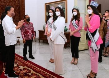 Presiden Joko Widodo menerima kunjungan Puteri Indonesia 2022 Laksmi Shari Suardana, Puteri Indonesia Lingkungan 2022 Cindy May McGuire, dan Puteri...