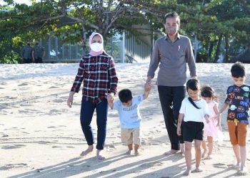 Rupanya mereka tidak sabar untuk segera bersentuhan dengan air laut. Setelah melepas sepatu, Presiden Jokowi mengajak cucunya berjalan ke bibir...