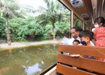 Dengan menggunakan shuttle bus, Presiden beserta keluarga kemudian mengikuti serangkaian wisata safari dengan menyusuri trek yang telah ditentukan. Presiden Joko...