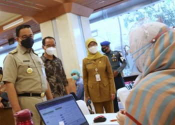 Gubernur Provinsi DKI Jakarta Anies Baswedan kembali meninjau kegiatan vaksinasi bagi wartawan dan pekerja media yang dilaksanakan Pemprov DKI di...