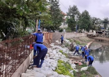 Personel Satuan Pelaksana Sumber Daya Air (Satpel SDA) Kecamatan Palmerah meninggikan tanggul Kali Grogol sisi timur sepanjang 100 meter. "...