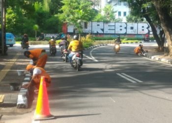 Enam personel Penanganan Prasarana dan Sarana Umum (PPSU) Kelurahan Gunung, Kebayoran Baru, Jakarta Selatan, mengecat ulang kanstin di Jalan Leuser,...