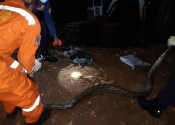 Petugas Suku Dinas Penanggulangan Kebakaran dan Penyelamatan (Sudin Gulkarmat) Sektor X Kecamatan Jagakarsa, Jakarta Selatan, berhasil mengevakuasi seekor ular sanca...