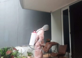 Petugas Penanganan Prasarana dan Sarana Umum (PPSU) melakukan penyemprotan disinfektan pada hunian warga di Jalan Tangkas Baru, RT 08/02, Kelurahan...