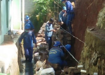 Sebanyak 15 anggota Satgas Sumber Daya Air (SDA) dan PPSU melakukan perbaikan turap saluran penghubung (Phb) sepanjang 15 meter yang...