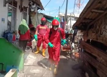 Petugas Sektor 7 Suku Dinas Penanggulangan Kebakaran dan Penyelamatan (Sudin Gulkarmat) Jakarta Utara dan Kepulauan Seribu melakukan disinfeksi fasilitas umum...