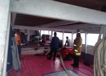 Petugas dari Sektor 8 Sudin Penanggulangan Kebakaran dan Penyelamatan (Sudin Gulkarmat) Jakarta Utara dan Kepulauan Seribu berhasil mengevakuasi kapal tradisional...