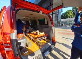 Personel Suku Dinas Penanggulangan Kebakaran dan Penyelamatan (Gulkarmat) Jakarta Selatan, Minggu (21/2), melakukan evakuasi medis pada pengendara motor yang alami...