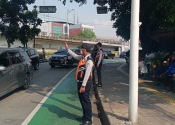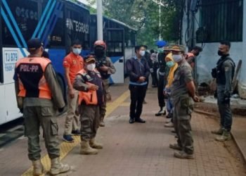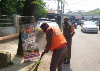 Petugas gabungan menggelar penertiban untuk menghalau pedagang kaki lima (PKL), ojek online, dan angkutan umum yang kerap mangkal di depan...