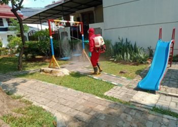 Petugas dari Sektor IV Suku Dinas Penanggulangan Kebakaran dan Penyelamatan (Sudin Gulkarmat) Jakarta Utara dan Kepulauan Seribu melakukan penyemprotan disinfektan...