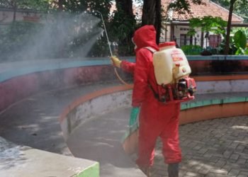 Petugas Suku Dinas Penanggulangan Kebakaran dan Penyelamatan (Gulkarmat) Jakarta Timur, Sabtu (13/3), melakukan penyemprotan rumah warga di Jl Rawamangun Muka...