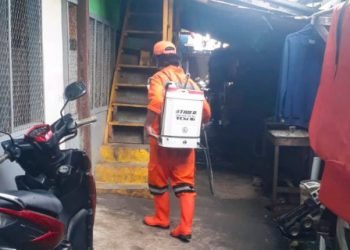 Lingkungan padat penduduk di wilayah RT 02 dan 03 RW 04 Kelurahan Karet Semanggi, Setiabudi, Jakarta Selatan, Jumat (12/3), disemprot...