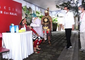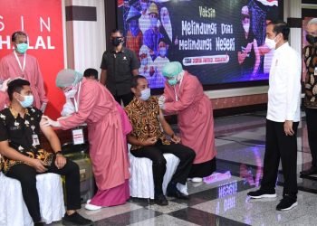 Presiden Republik Indonesia, Joko Widodo, meninjau pelaksanaan vaksinasi Covid19 massal yang diperuntukkan bagi para pelayan publik di Gedung Gradhika Bhakti...