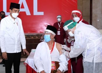 Presiden Republik Indonesia, Joko Widodo, meninjau pelaksanaan vaksinasi Covid19 massal yang diperuntukkan bagi para ulama, tokoh lintas agama, dan para...