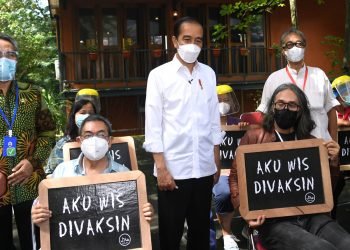 Presiden Republik Indonesia, Joko Widodo, meninjau vaksinasi massal yang diperuntukkan bagi 517 seniman dan budayawan di Padepokan Seni Bagong Kussudiarja...