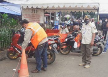 Aparatur kelurahan bersama Satpol PP, LMK, FKDM serta para pengurus RT dan RW, menyosialisasikan penerapan protokol kesehatan (Prokes) kepada warga...