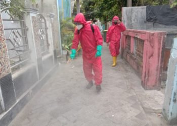 Petugas Sektor 7 Suku Dinas Penanggulangan Kebakaran dan Penyelamatan (Sudin Gulkarmat) Jakarta Utara dan Kepulauan Seribu melakukan disinfeksi di lingkungan...