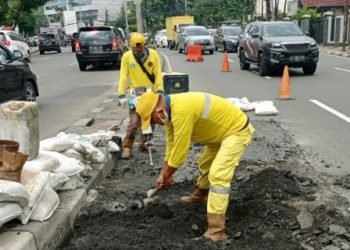 Satuan Tugas Bina Marga Kecamatan Tanah Abang, Selasa (23/2), memperbaiki dua titik jalan berlubang di Jalan Penjernihan, tepatnya di depan...