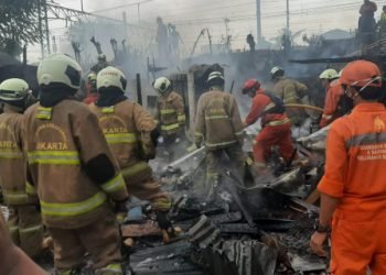 Petugas Sudin Penanggulangan Kebakaran dan Penyelamatan Jakarta Timur berhasil memadamkan api yang membakar dua rumah dan satu warung di Jl...