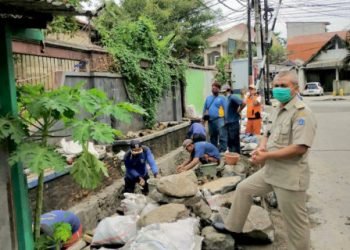 Warga dan petugas gabungan PPSU, Satgas Sudin Sumber Daya Air, Bina Marga, Lingkungan Hidup serta Gulkarmat, Rabu (10/2), melakukan kerja...