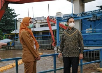 Gubernur DKI Jakarta, Anies Baswedan meninjau kondisi pintu air di Manggarai, Jakarta Selatan untuk memantau tinggi muka air, Senin (8/2)...