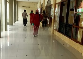 Sektor 8 Suku Dinas Penanggulangan Kebakaran dan Penyelamatan (Gulkarmat) Jakarta Utara dan Kepulauan Seribu melakukan disinfeksi di Puskesmas Kelurahan Pulau...
