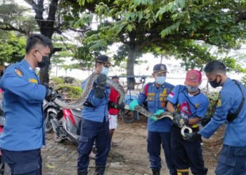 Seekor ular sanca sepanjang kurang lebih empat meter berhasil dievakuasi petugas dari atap warung di Jalan Kampung Baru, RT 01/03,...