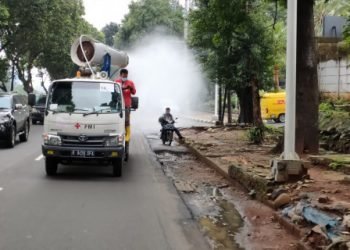 Empat titik jalan di wilayah Kelurahan Kebagusan, Jagakarsa, Jakarta Selatan, disemprot disinfektan oleh petugas PMI DKI Jakarta, Rabu (3/2). "Warga...