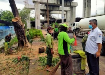 Satu pohon Angsana di Interchange Cawang, Kebon Pala, Makasar, Rabu (3/2), ditoping 10 personel Satgas Sudin Pertamanan dan Hutan Kota...