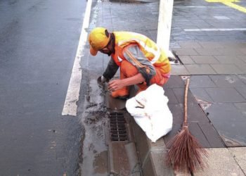 Empat petugas Penanganan Prasarana dan Sarana Umum (PPSU) Kelurahan Bangka, Mampang Prapatan, Jakarta Selatan, Rabu (3/2), membersihkan tali-tali air di...