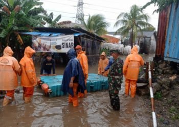 Puluhan petugas gabungan dikerahkan untuk mengatasi genangan yang terjadi di RT 03/05, Kampung Sepatan, Kelurahan Rorotan, Cilincing, Jakarta Utara. "...