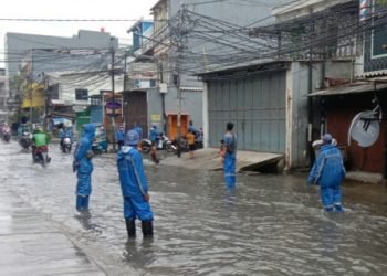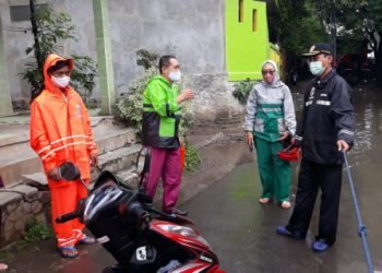 Petugas Satgas Sumber Daya Air (SDA) dikerahkan untuk mengatasi genangan di Jl Jelambar Baru, Grogol Petamburan, Jakarta Barat. Saat ini...