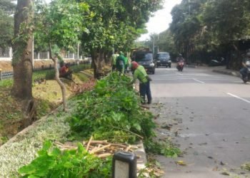 Suku Dinas Pertamanan dan Hutan Kota Jakarta Selatan memapas tiga pohon di Jalan Raya Lenteng Agung, Jagakarsa, Jakarta Selatan, Selasa...
