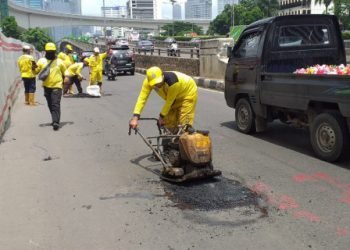 Suku Dinas Bina Marga Jakarta Selatan menambal jalan berlubang di sepanjang Jalan Gatot Subroto, demi keamanan dan kenyamanan pengendara yang...