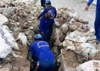 Satuan Pelaksana Sumber Daya Air (Satpel SDA) Kecamatan Tanjung Priok membersihkan saluran penghubung (PHB) Sunter Kemayoran di Jl Sunter Kemayoran,...