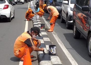 Petugas Penanganan Prasarana dan Sarana Umum (PPSU) Kelurahan Duren Tiga, Pancoran, Jakarta Selatan, Senin (1/2), melakukan pengecatan ulang kanstin di...