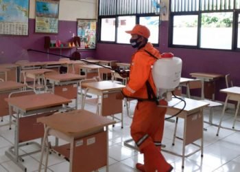 Dua petugas PPSU Kelurahan Cipete Utara, Kebayoran Baru, Jakarta Selatan, melakukan penyemprotan disinfektan gedung SDN Cipete Utara 13 Pagi, Jalan...