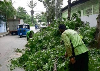 Sebanyak 12 pohon angsana yang rimbun serta rawan tumbang di Jalan Perdana, Grogol Petamburan dipangkas oleh petugas gabungan dari unsur...
