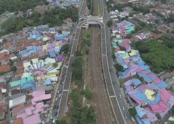 Program beautifikasi kawasan flyover tapal kuda Lenteng Agung, Jakarta Selatan, yang dilakukan dengan pengecatan atap rumah warga sejak 2 Desember...