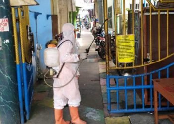 Lima petugas Penanganan Prasarana dan Sarana Umum (PPSU) hari ini melakukan penyemprotan disinfektan di kawasan permukiman warga RW 04 dan...